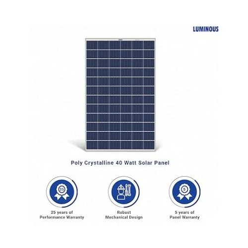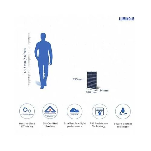 - BIS Certified – Luminous solar panels are BIS certified as per IS/IEC standards; Space Requirement – 5-6 sq. feet (approx.) for a single panel.